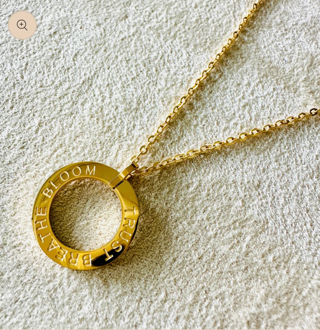 Trage die inspirierende Botschaft "TRUST BREATHE BLOOM" mit dieser eleganten Mantrakette aus Edelstahl in Silber oder Gold. Die Kette ist hypoallergen, wasserfest, langlebig und nachhaltig.